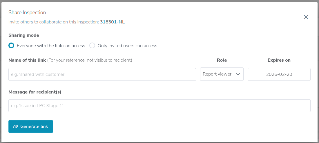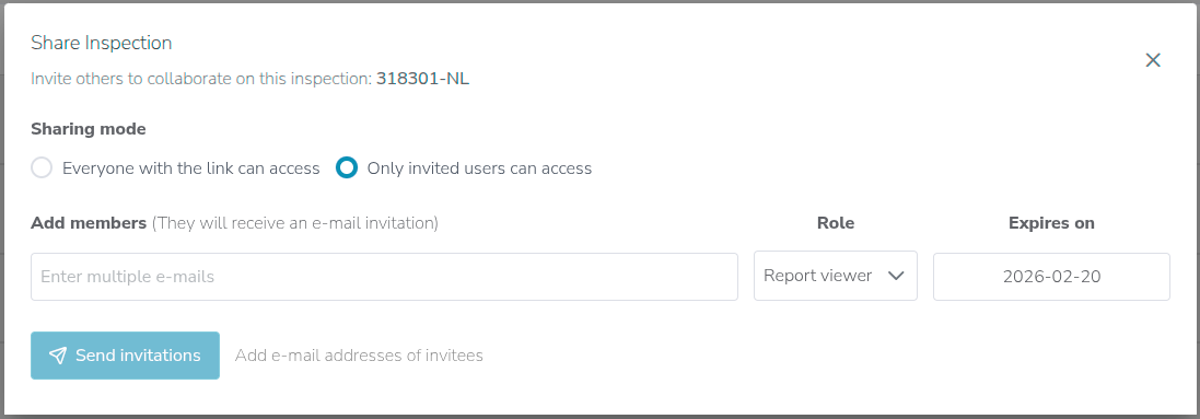 You have the flexibility to set a role according to your needs. After configuring the permissions, click Generate link to receive a link that can be shared. In the case of sharing inspections with specific email addresses, click Send invitations to invite guests.