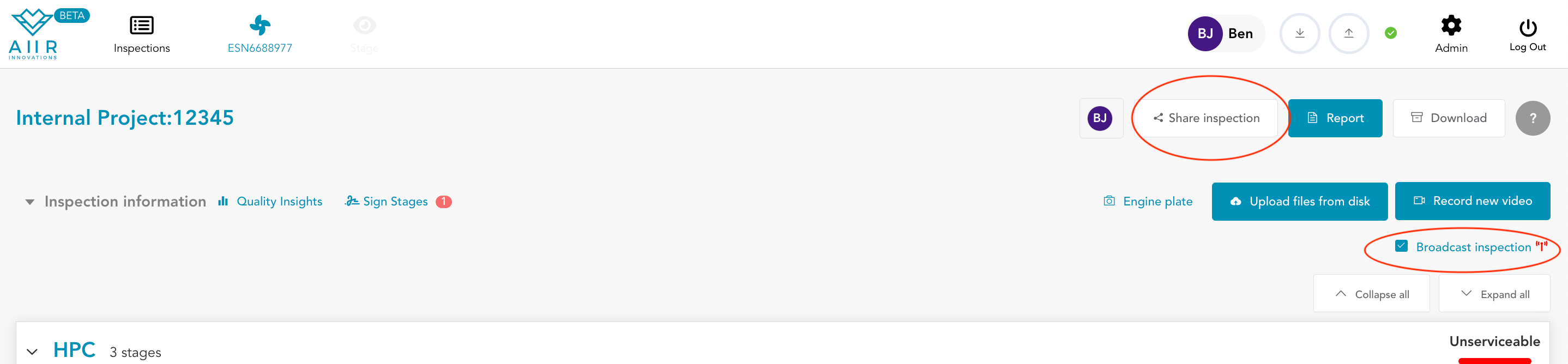 Aiir empowers you to collaborate with colleagues or customers in real-time by offering them a live view of the inspection through the Inspection Broadcasting feature. Here's how to use it: