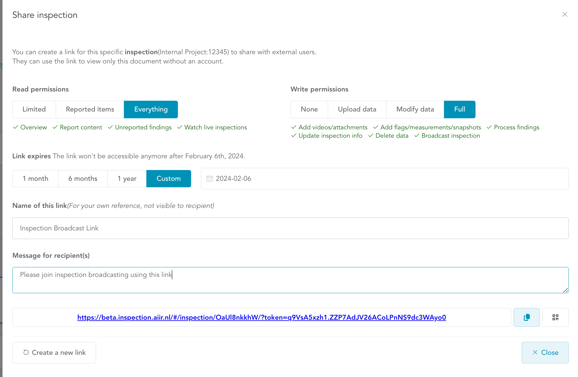Click on 'Share Inspection' to generate an inspection URL that you can share with the participants. This can include both Aiir users and external parties.