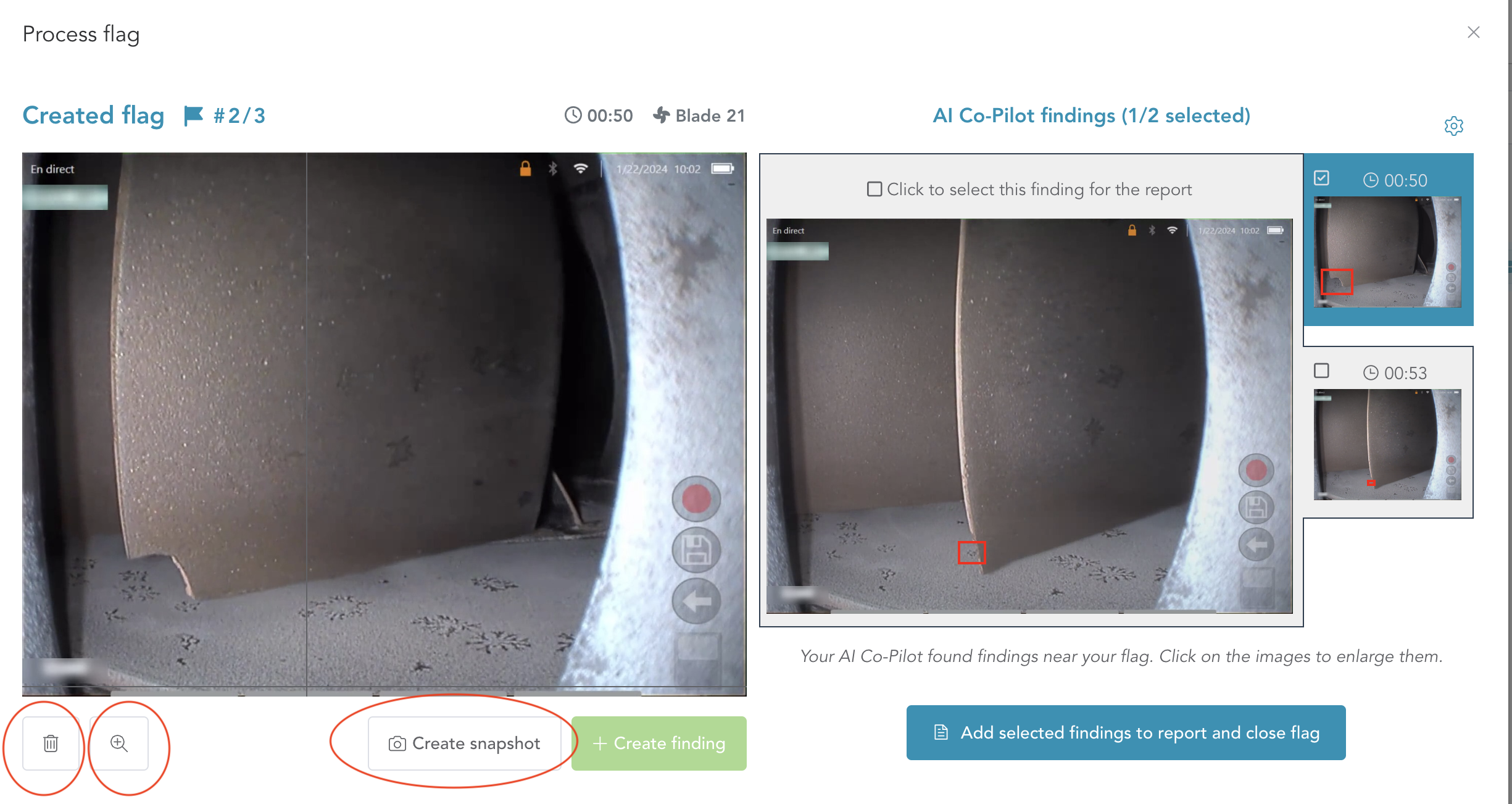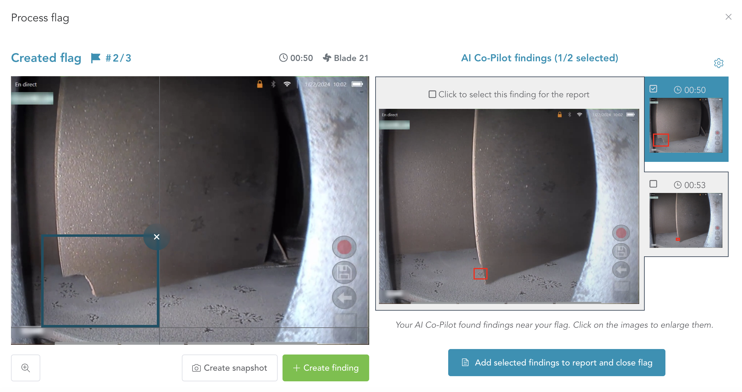 Create Your Own Finding: If you disagree with the AI suggestions, you can draw your own bounding box around the defect on the left image. Once you've drawn the bounding box, the 'Create Finding' button will become active, allowing you to convert the flag into a finding.