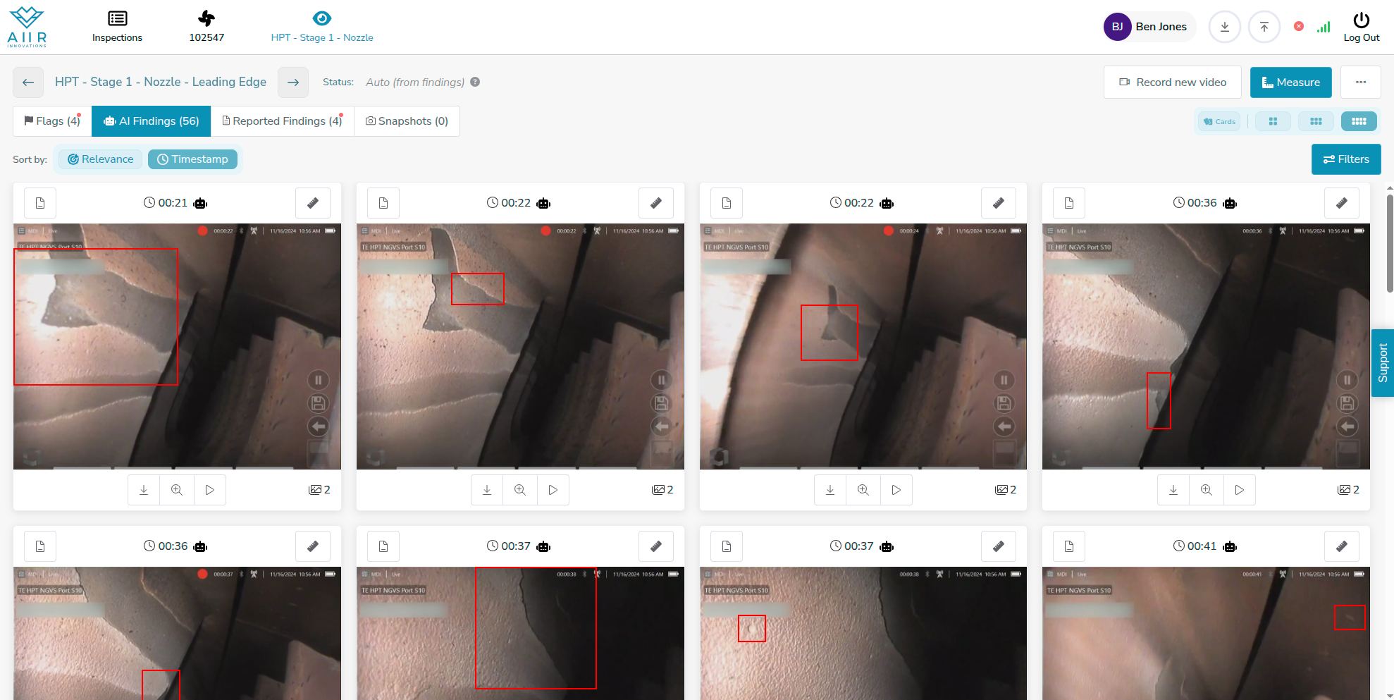 In the ‘Al Findings' tab, you will find a comprehensive list of suggestions made by Aiir Co-pilot after processing all the video footage. This section allows you to review these suggestions and select the most pertinent findings to include in your inspection report. The findings are sorted by either ‘Timestamp’ of the video or in the order of ‘Relevance’ (newly introduced).