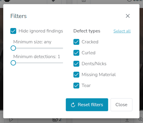Filter : In this dialog, you can filter out findings. Available filters allow you to filter on defect size, the number of AI images per defect and defect type. Additionally, you can choose to view all findings auto-filtered by the AI by deselecting the “Hide ignored findings” option.