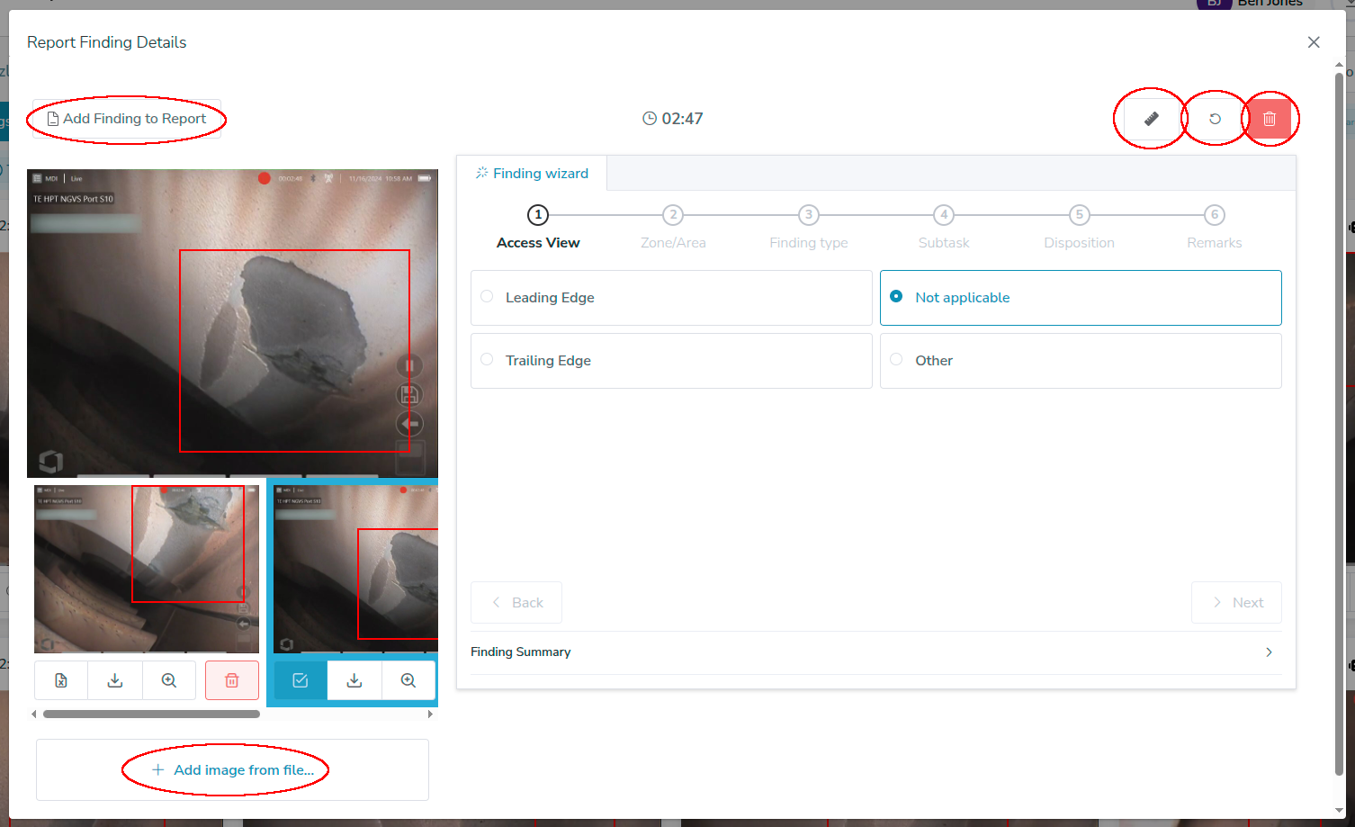 View Finding: To examine a particular finding more closely, begin by clicking on its thumbnail. This action will open the finding in detailed mode. In this view, you'll see the finding image on the left side, complete with a bounding box drawn around the area of interest. On the right side, you'll find a form with fields to input additional details about the finding.