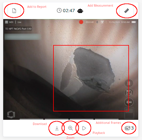 Thumbnail Options : The thumbnail header indicates the timestamp in the video or the blade number, if available. It also has icons to ‘Add to report’ or ‘Add measurement’ to the finding. You can also download, zoom or play any thumbnail using the ‘Download’, ‘Zoom’ and ‘Playback’ icons give in the bottom of the thumbnail. If the finding is already added to the report or if the measurement exists against the finding, the 'Add to Report’ and 'Measurement’ icons are highlighted in blue.