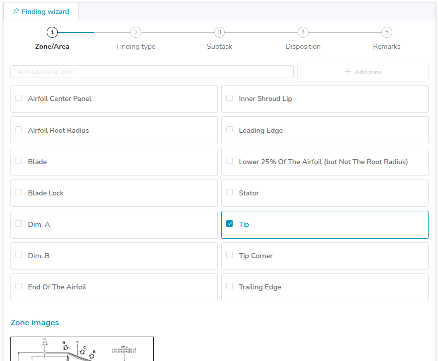 Step 1: Select Zone/Area : In this step, Aiir Assisted Reporting fetches list of Zone/Areas for the module you want to report the defect for. The images of engine zones are provided (fetched from the manual) for easier reference and assistance in determining the finding position and making a decision. One can even zoom the images to take a closer look.