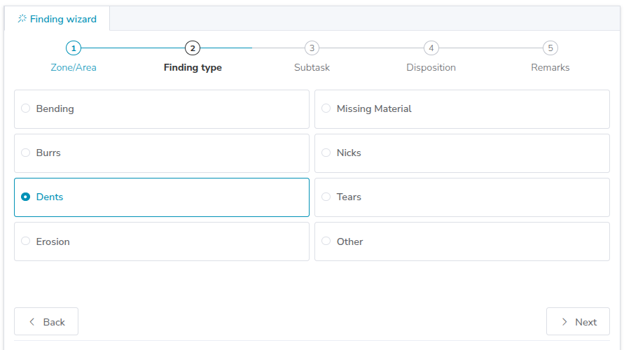 Step 2: Finding Type Classification: In this step, Aiir Assisted Reporting fetches list of all possible defects that one can find in the selected Zone/Area you selected in the previous step.