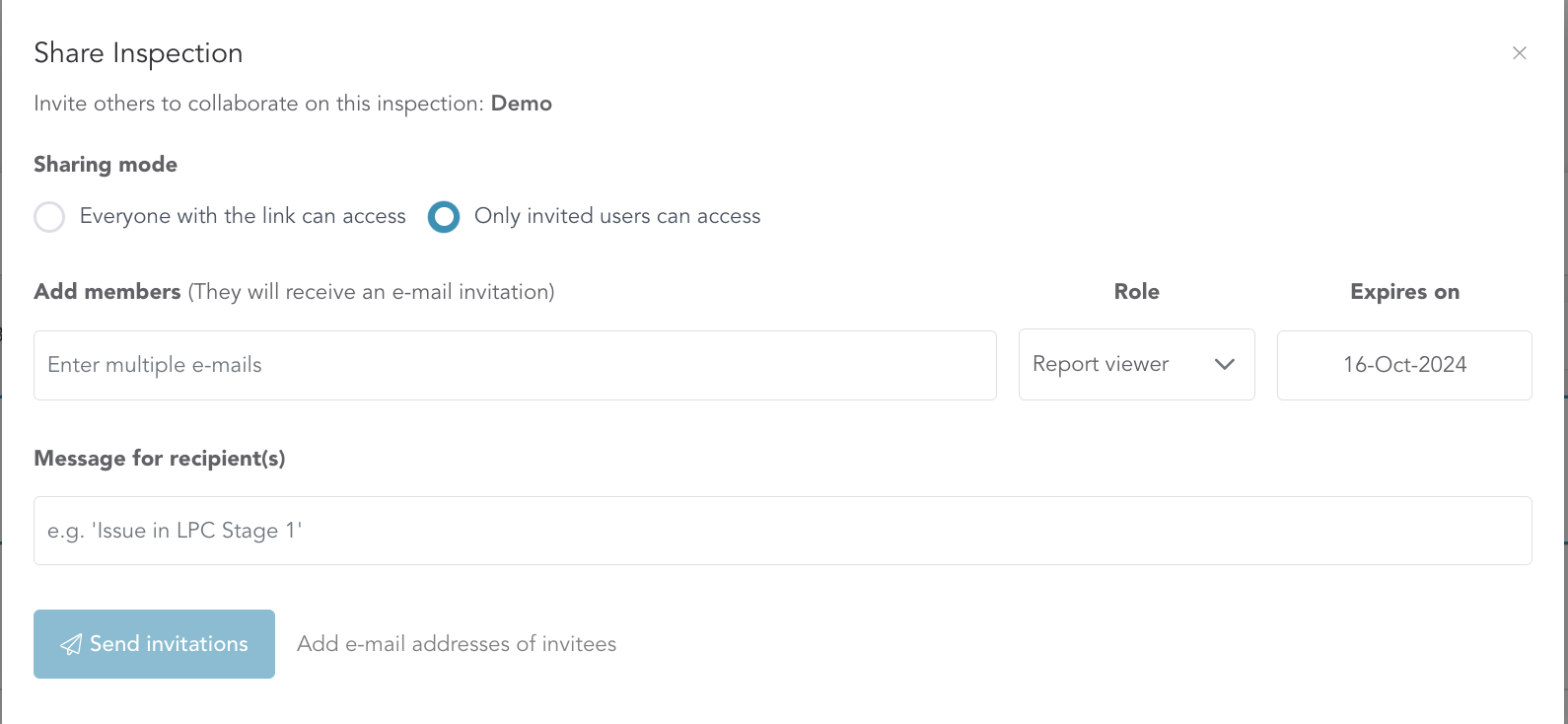 Expires On: You can set the date by which the shared inspection link will expire. The recipient will not be able to access the inspection after this date. You can always come back and extend the date as needed.