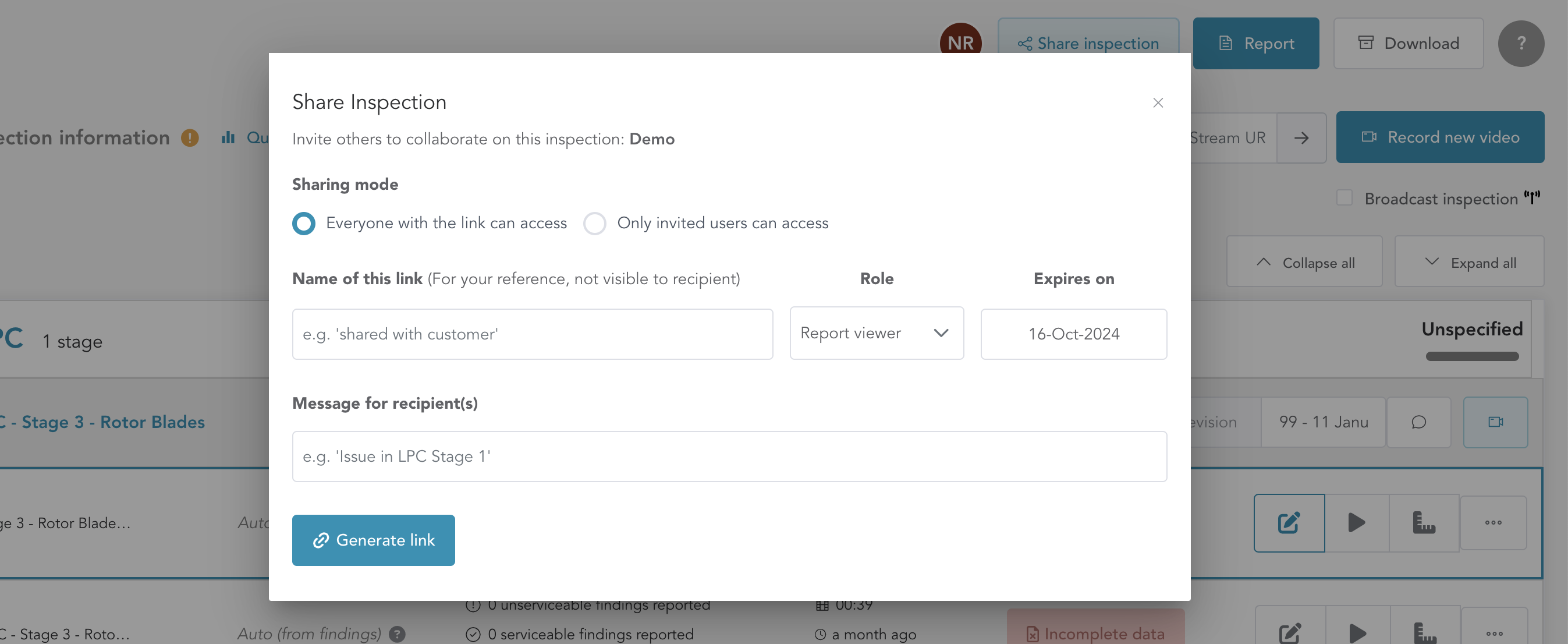 Once you click on 'Share Inspection' icon, a sharing configuration screen will appear (as show below), offering the following options: