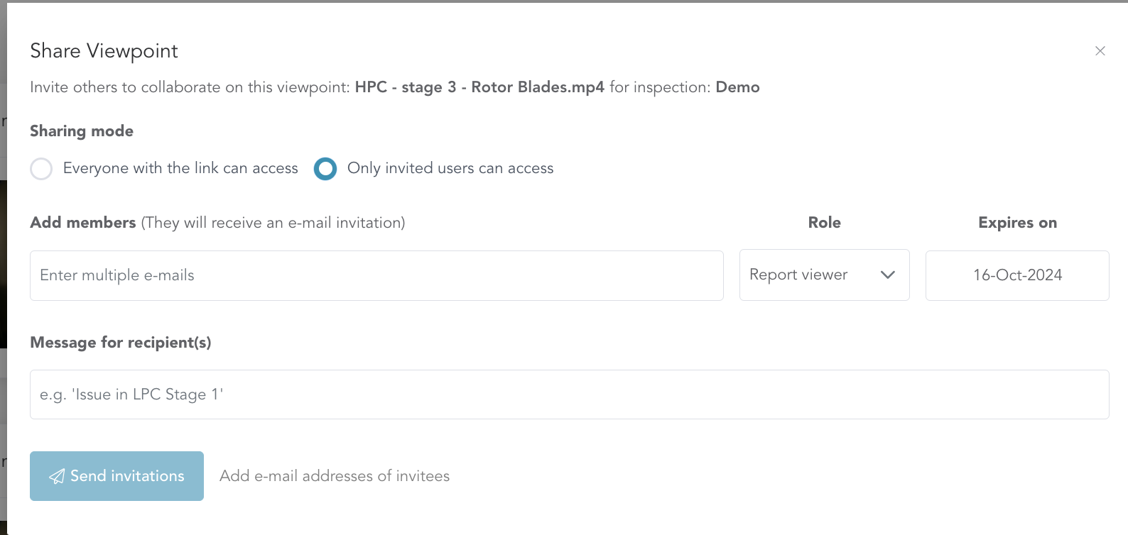 Only Invited Users can access :- This option is more secure, and enables you to enter a valid email id of the person with whome you would like to share the inspection.