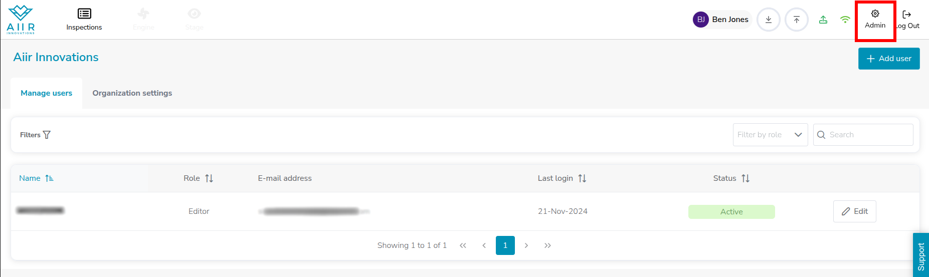 As an administrator for Aiir platform, you would see an additional 'Admin' icon on the top-right of the application, that would enable you to add/modify/remove users from the Aiir platform.