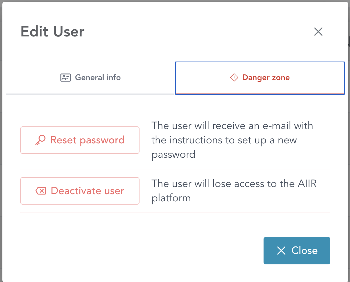 To remove access to Aiir, click on ‘Edit’ button on the right against any user name to view user details and click on ‘Danger Zone’ tab, where you’ll find ‘Deactivate user’ button. Clicking on this would deactivate the user from Aiir and remove their access to the application.