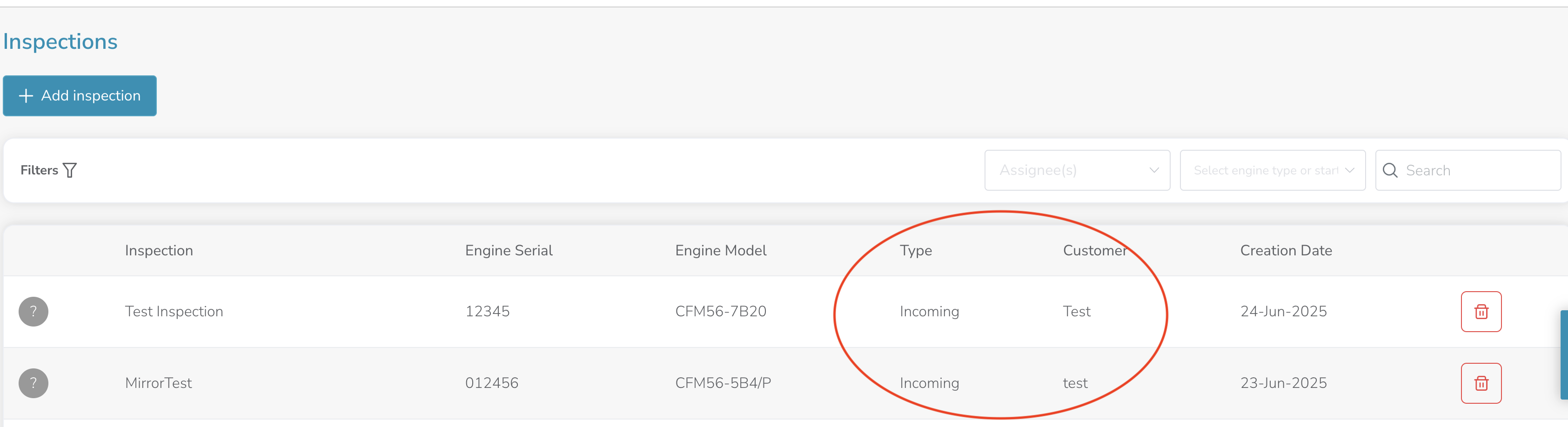 The inspection list now includes two new columns: