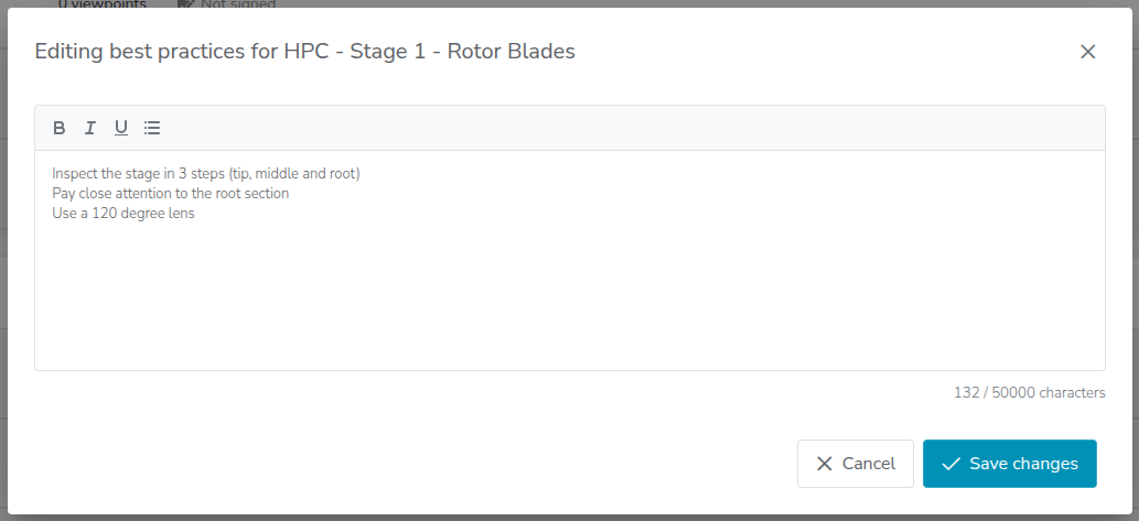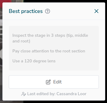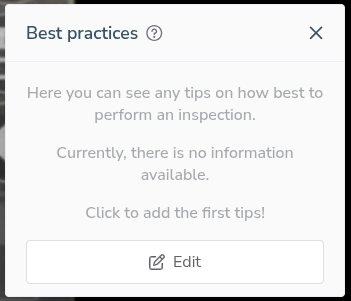 The Best Practices pop-up is your dedicated tool for team knowledge sharing. It appears in the Recording and Measurement screens to let you quickly review tips and notes on how to perform an inspection left by other inspectors.