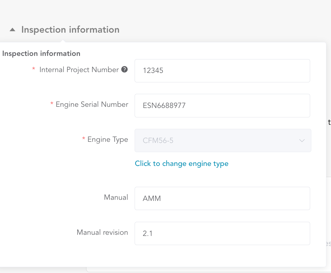 This is also the view where you can change information like Engine S/N, Project number etc, even after inspection is in-progress or completed.